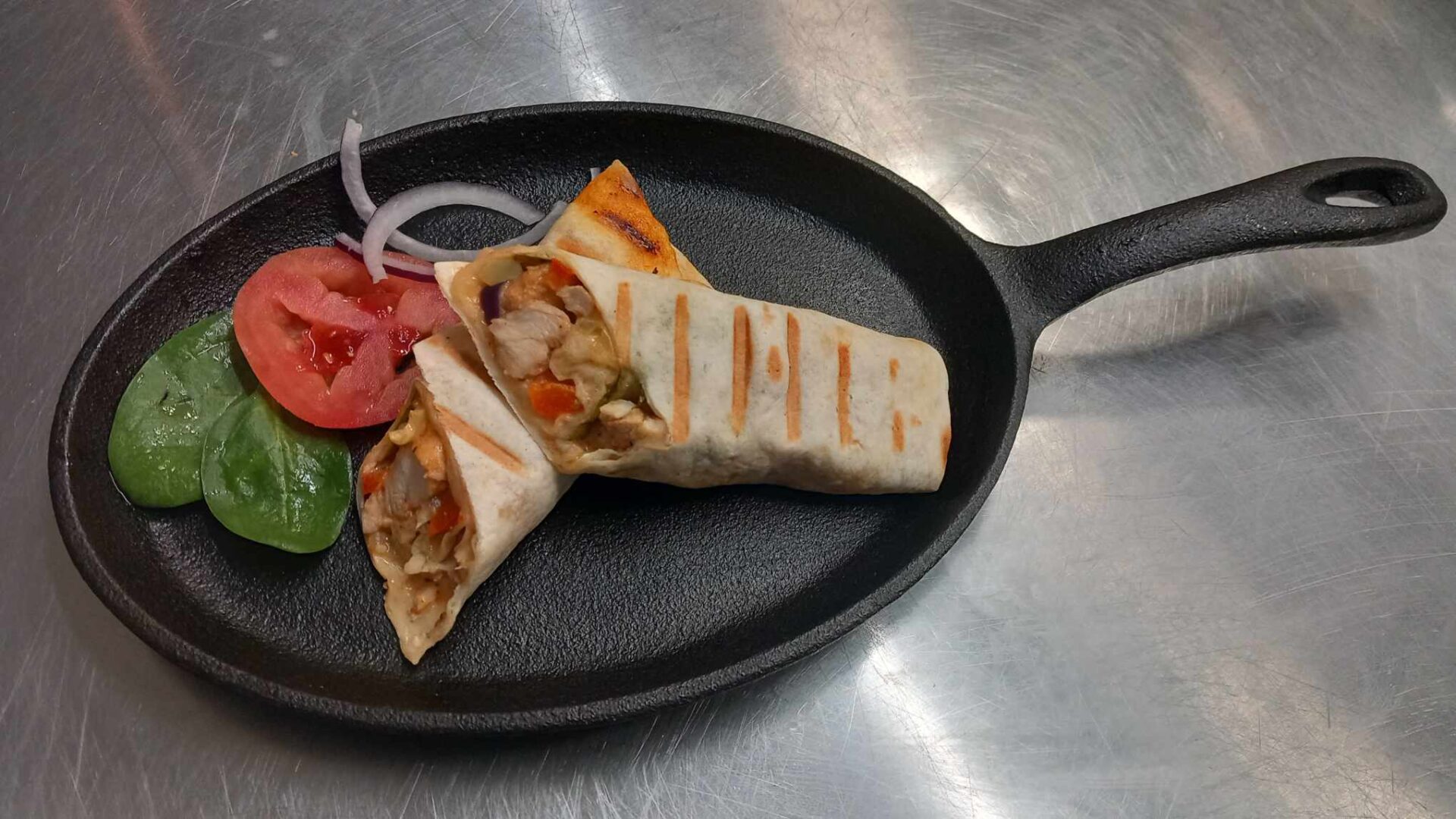 Tortilla s kuřecím masem (zelenina, dip), na rautu 2 půlky v alobalu
