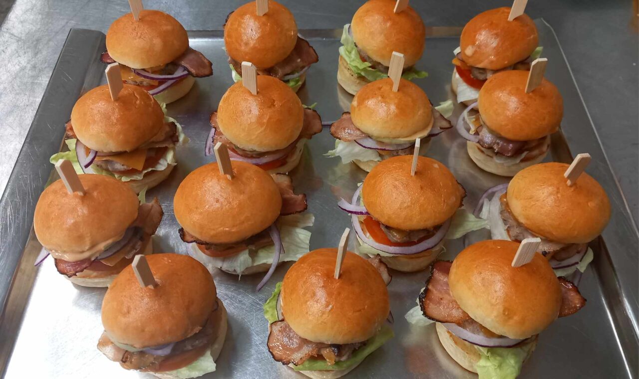Minihamburgery - domácí bulky, mleté vepřové maso, zelenina, cheddar, slanina, dip